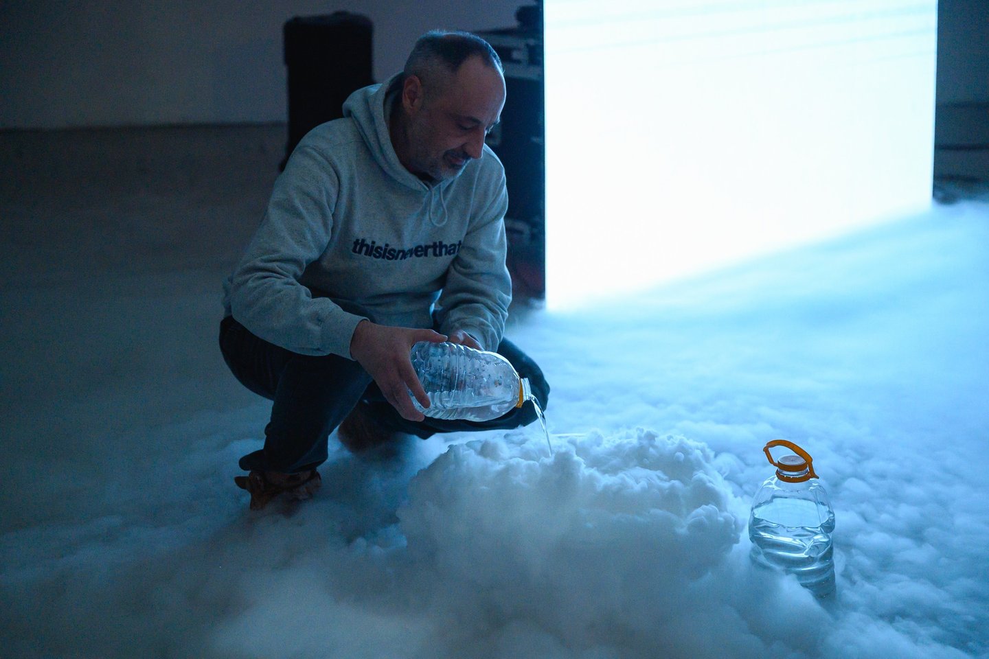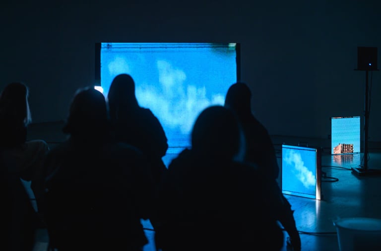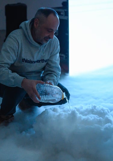 The constantly shifting ambient environment incorporates acoustic segments, such as church bells historically used as protection against hail, while simultaneously gently questioning the reciprocal relationship between weather and human interventions on the ground. The eyes follow the recurring element of the meteorological balloon, which functions as both a digital and material object of projection. The balloon inflates to the rhythm of breath from Vladimir’s lungs, lies deflated on a laboratory table, and simultaneously rises above a blue, anonymous urban sphere.
