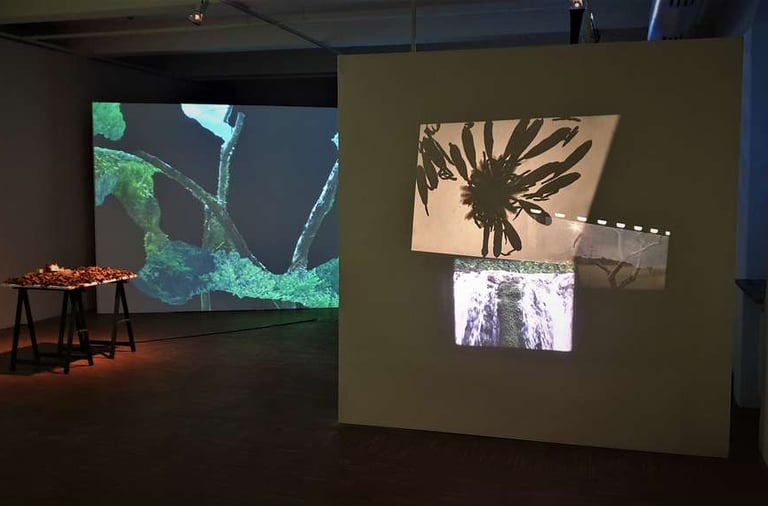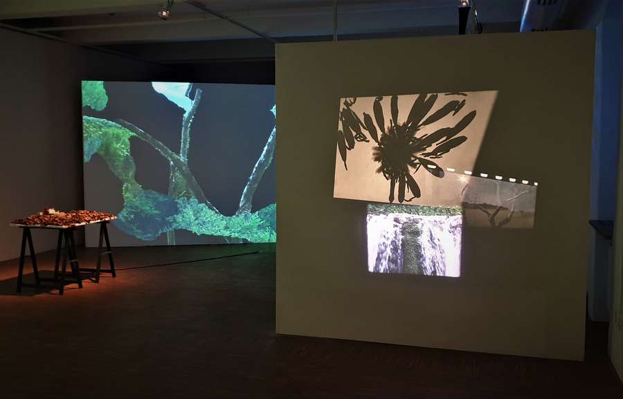Installation: videos, sound, objects, natural elements, 16mm film, 35mm film, herbarium, book