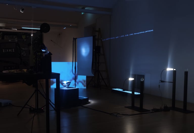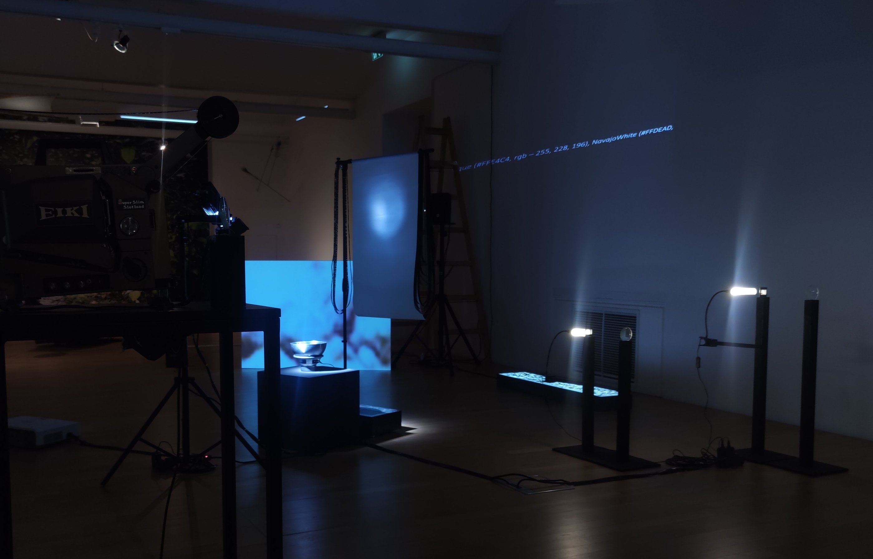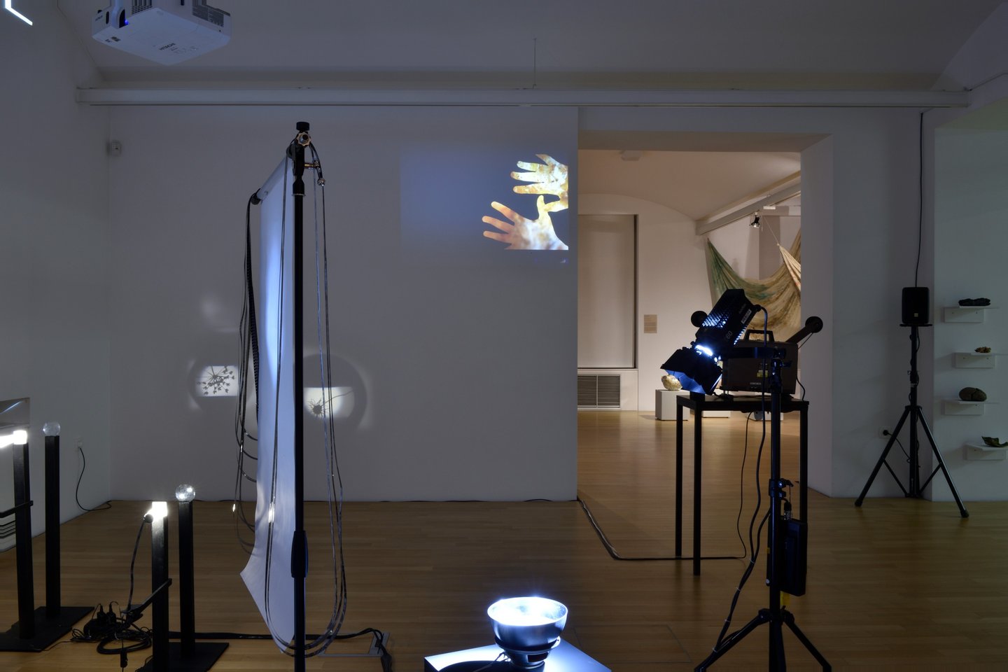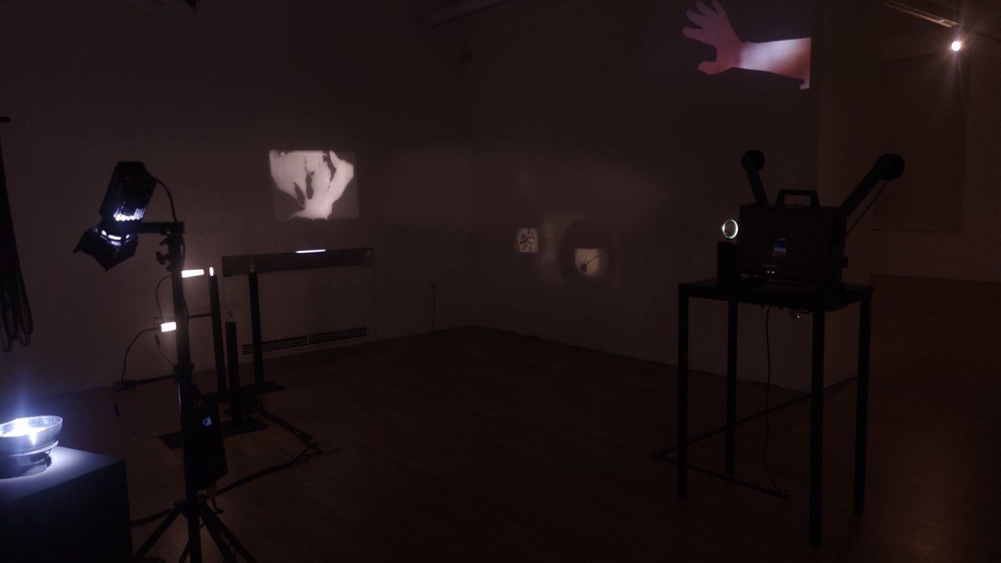 In the installation, we are surrounded by its holistic presence, which is enhanced by the multiplicity of frames in the projections and the density of the sonic narratives, while individual elements are approached gradually. The volume of material results from its continuous accumulation and multiplication, and simultaneously, the media used by the artist, her experimentation with them, and the acquisition of new knowledge constantly open up new possibilities for its presentation. The sensory installation combines both contemporary and analog technologies: analog 16mm and 35mm film, projections, animation, light objects, natural objects, a kinetic object, sound, and text. The viewer can immerse themselves in the sensory stimuli, while a special atmosphere is created through lighting – which loosens the physical boundaries of perception. The audience is allowed to move among the presented elements and observe the installation from different perspectives, encouraging reflection on their own perception. The artist creates situations – dissecting and opening up the multilayered nature of the material and perspectives on it, with the aim that the observer may continue to construct meaning on their own.