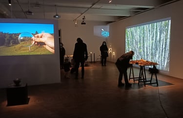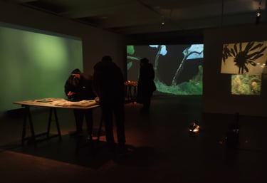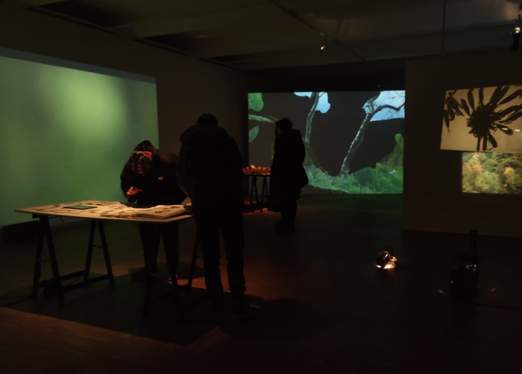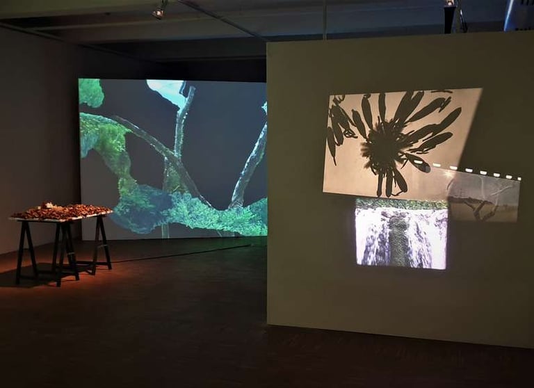 Installation: videos, sound, objects, natural elements, 16mm film, 35mm film, herbarium, book