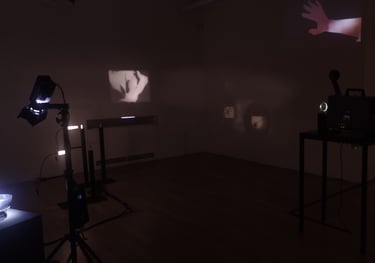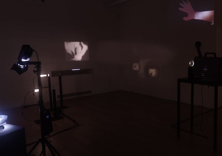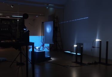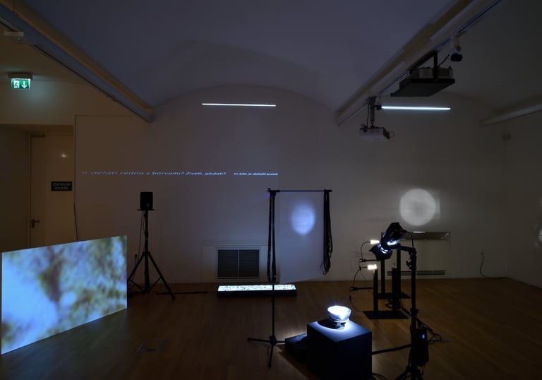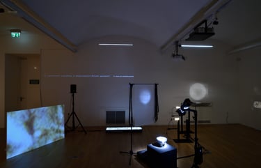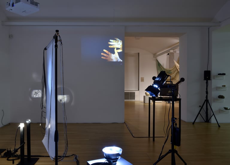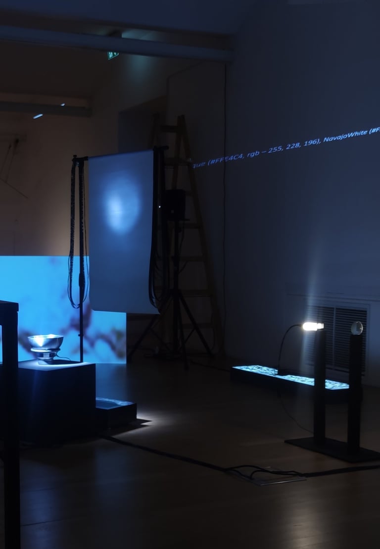 In the installation, we are surrounded by its holistic presence, which is enhanced by the multiplicity of frames in the projections and the density of the sonic narratives, while individual elements are approached gradually. The volume of material results from its continuous accumulation and multiplication, and simultaneously, the media used by the artist, her experimentation with them, and the acquisition of new knowledge constantly open up new possibilities for its presentation. The sensory installation combines both contemporary and analog technologies: analog 16mm and 35mm film, projections, animation, light objects, natural objects, a kinetic object, sound, and text. The viewer can immerse themselves in the sensory stimuli, while a special atmosphere is created through lighting – which loosens the physical boundaries of perception. The audience is allowed to move among the presented elements and observe the installation from different perspectives, encouraging reflection on their own perception. The artist creates situations – dissecting and opening up the multilayered nature of the material and perspectives on it, with the aim that the observer may continue to construct meaning on their own.