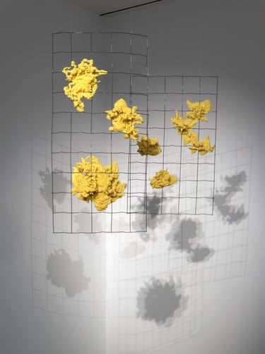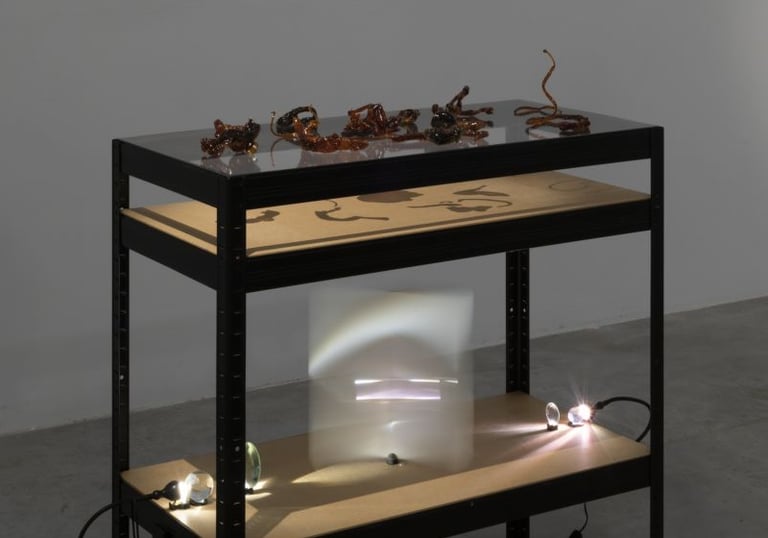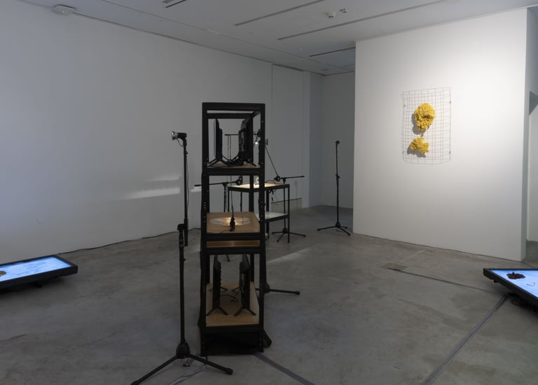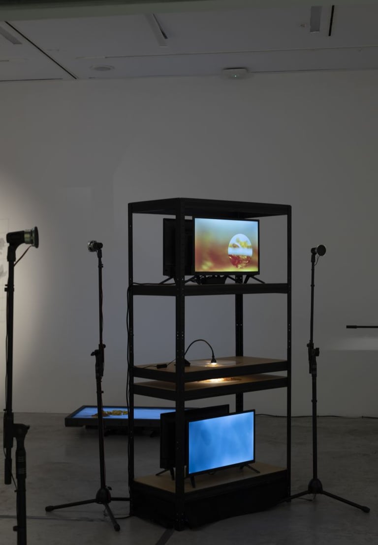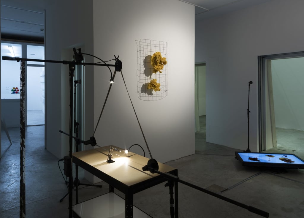 Multimedia installation Touches, Changes, Viscous Time presents the artist’s methodological approach that is in itself part of the artwork and the prism through which the individual elements are to be viewed – not separately, but as enmeshed in a dynamic network of relations that become the core and the structure of the work. The numerous elements constituting the installation function as connecting threads between artistic forms, further structuring our communicational existence. Knez organizes individual groups into sound, light, and material components and moving pictures on screens that together form a choreography of dynamic fictional shapes, transformed or redirected into new structures and energies.